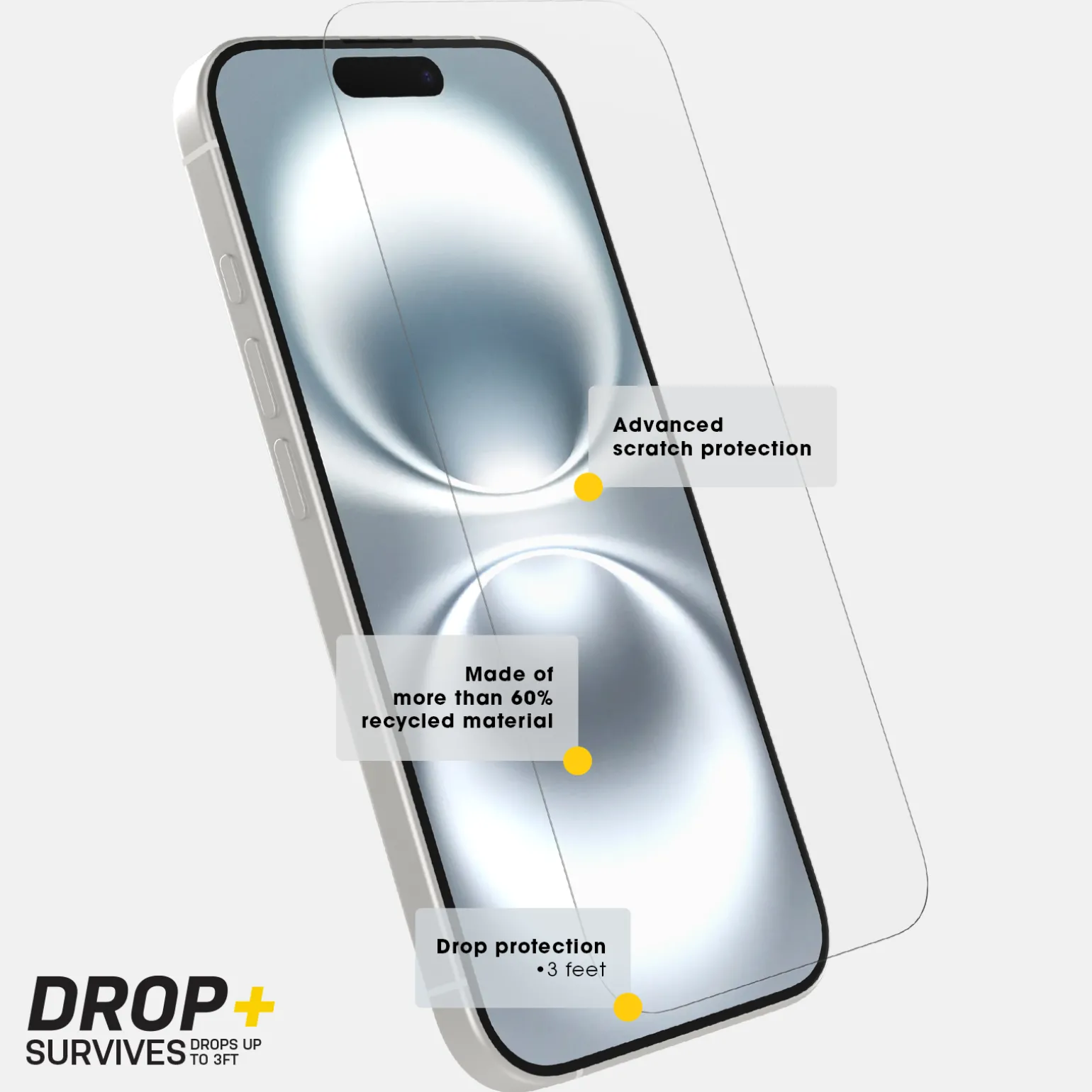 Premium Glass is shatter resistant when dropped from 3ft while letting the vibrant quality of your display shine through. The ultra-thin tempered iPhone 16 Pro glass screen protector is fingerprint resistant and made with more than 60% recycled material.
